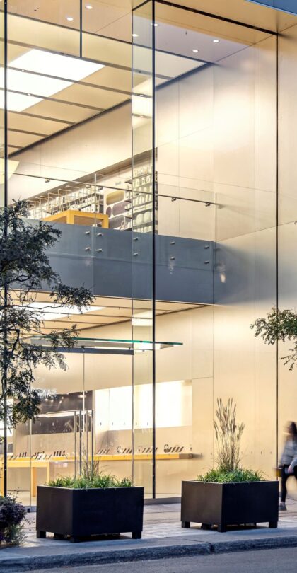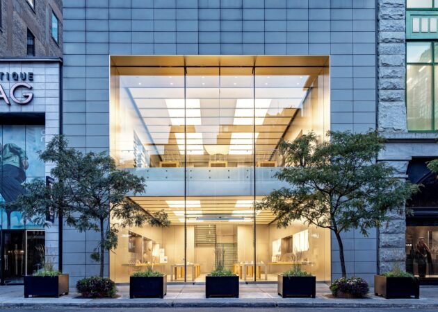 Apple’s Sainte-Catherine Street store sits within one of Montreal’s most recognisable and tightly managed retail corridors. The public realm along this stretch is defined by consistent civic design elements — including municipally specified planters that shape pedestrian flow and seasonal planting.